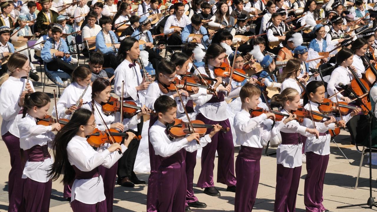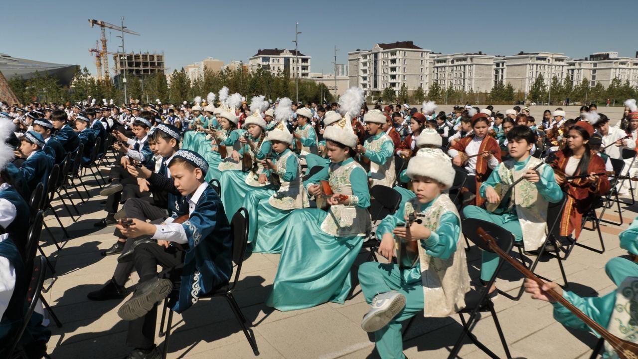 Звучание различных инструментов, включая домбру, кобыз, кыл-кобыз, жетыген, сазсырнай, флейту и скрипку, слилось в единый поток, символизируя единство многонациональной страны.