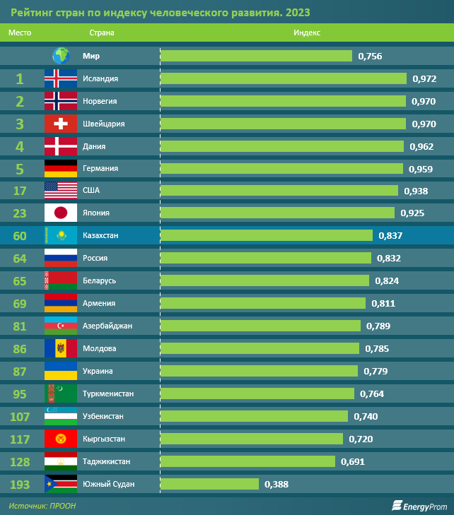Судя по индексу человеческого развития, Казахстан относится к странам с высоким уровнем развития экономики. В 2023 году РК заняла в рейтинге 60-е место из 193 с индексом 0,837. В сравнении с другими государствами СНГ и ЦА у Казахстана самый высокий показатель. Чуть меньше ИЧР у России (0,832) и Беларуси (0,811). Страны ЦА расположились в рейтинге ниже: Туркменистан — на 95-м месте с индексом 0,764, Узбекистан — на 107-м, Кыргызстан — на 117-м, Таджикистан — на 128-м.