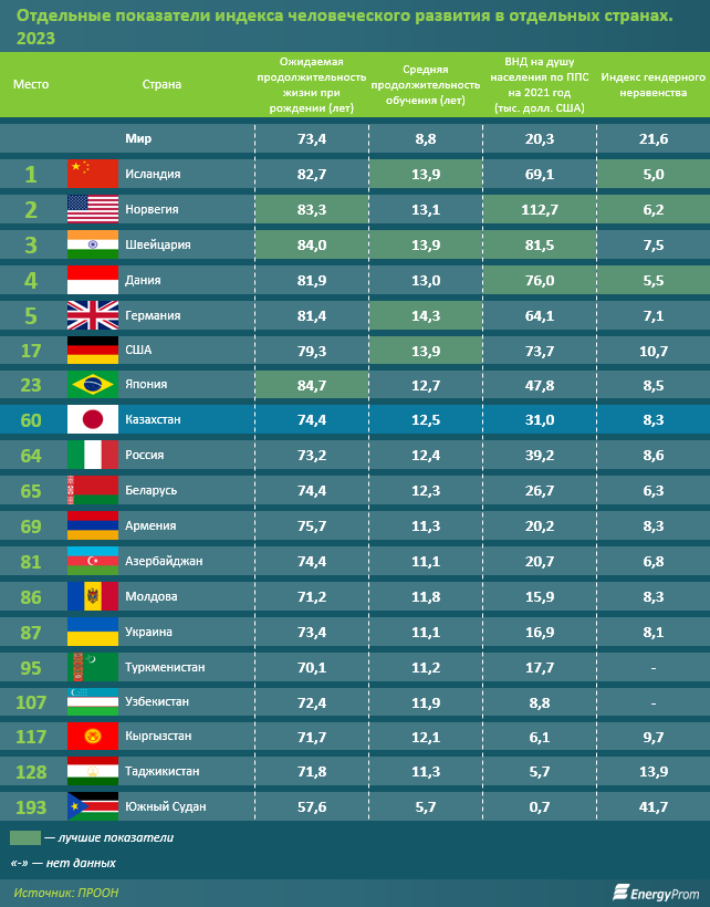 Показатели РК — страны, находящейся в верхней половине рейтинга — выше среднемировых. Казахстанцы имеют чуть повышенную продолжительность жизни, меньший показатель гендерного неравенства, более высокий, чем в среднем по планете, ВНД по ППС.