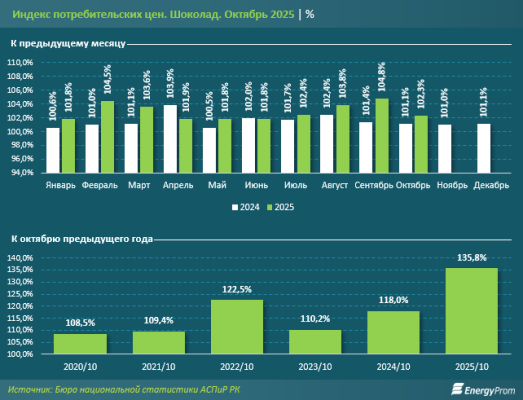 По итогам октября 2025 года шоколад в Казахстане подорожал на 2,3% за месяц. В прошлом месяце цены выросли сразу на 4,8%, что стало вторым по значимости месячным удорожанием за всё время (наибольшее удорожание — на 5% — было отмечено в ноябре 2015 года). Цены на шоколад растут уже 78 месяцев подряд.