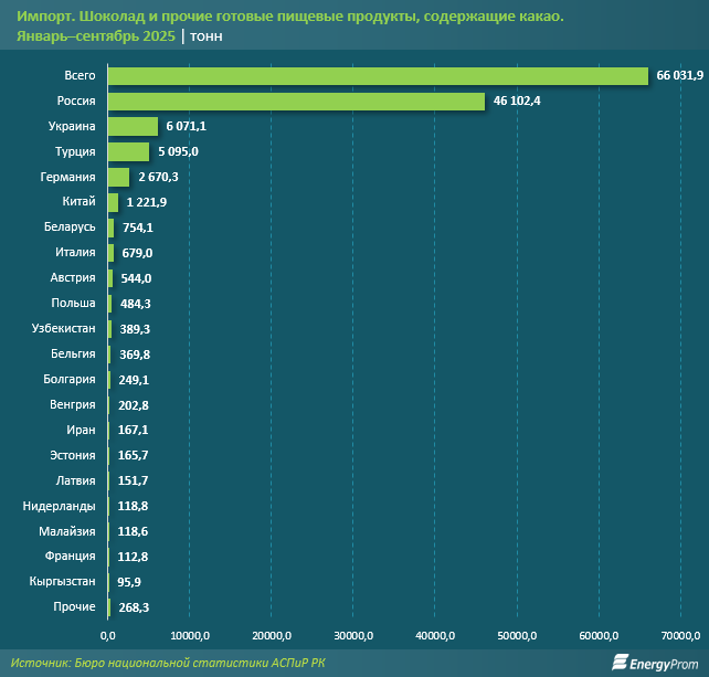 За девять месяцев текущего года в РК импортировали 66 тыс. тонн шоколада и прочих готовых пищевых изделий, содержащих какао, на сумму 340,2 млн долл. США. По сравнению с январём-сентябрём 2024-го объём импорта увеличился на 8,9% в натуральном и сразу на 37,3% в денежном выражении. Стоимость тонны импортированного шоколада и готовых пищевых изделий с содержанием какао за год выросла на 26,1%: с 4,1 тыс. до 5,2 тыс. долл. США.