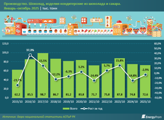 В Казахстане, в свою очередь, производство шоколада и кондитерских изделий из шоколада и сахара сокращается второй год подряд. Так, за январь–октябрь текущего года выпуск в секторе составил 72,6 тыс. тонн — на 2,9% меньше, чем за аналогичный период 2024-го. Годом ранее наблюдался спад сразу на 14,8%.