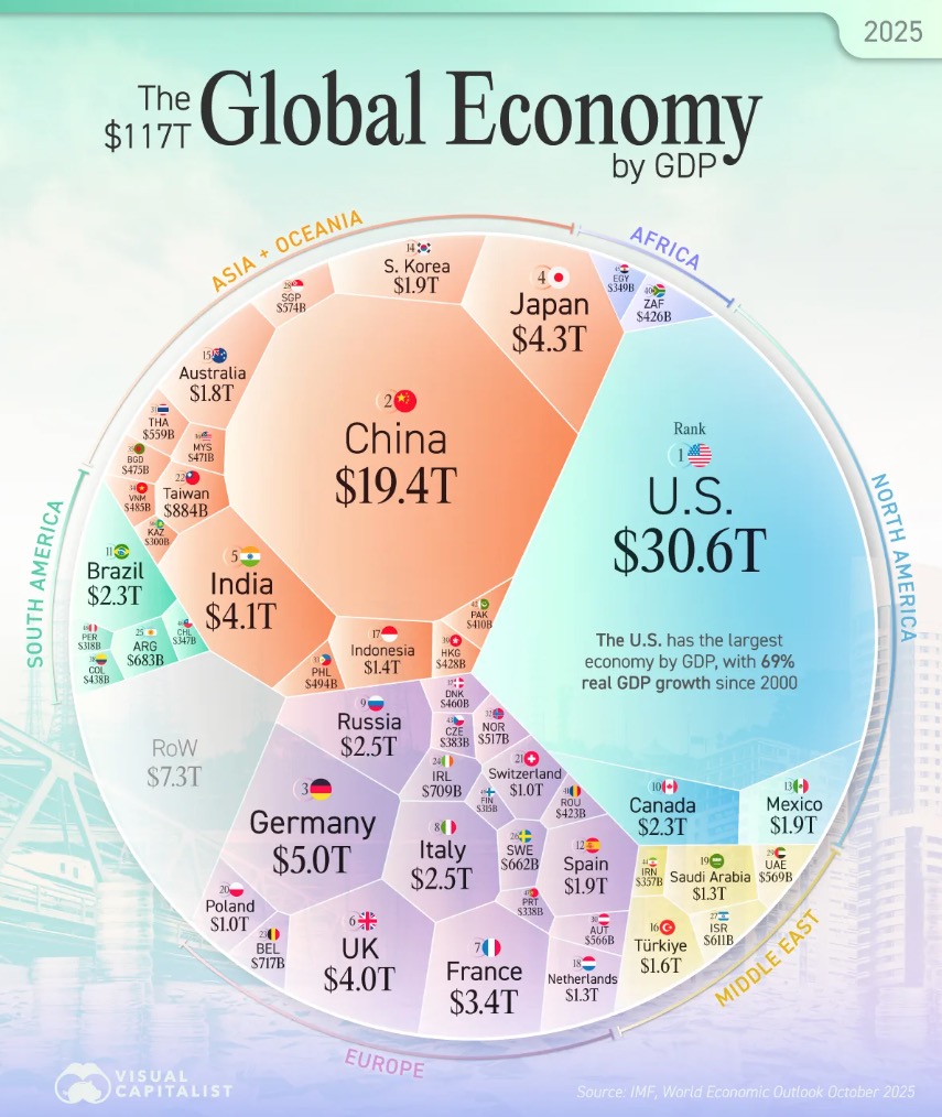 Визуализация мировой экономики объемом $117 трлн наглядно показывает: центр роста постепенно смещается, а разрыв между лидерами и догоняющими становится все более заметным. В ближайшие годы именно эти дисбалансы будут определять глобальную экономическую повестку.