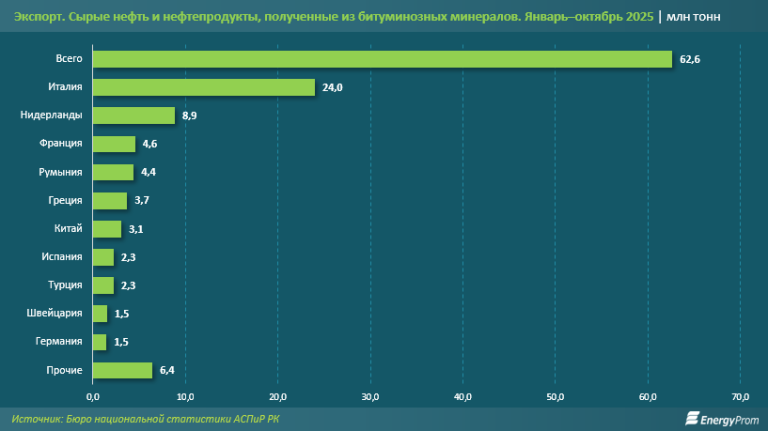 Основными направлениями экспорта нефти из РК оставались Италия и Нидерланды: 24 млн и 8,9 млн тонн соответственно, что суммарно составило более половины от всего объёма. Значительные объёмы также пришлись на Францию (4,6 млн тонн), Румынию (4,4 млн тонн) и Грецию (3,7 млн тонн). Экспорт нефти в Китай составил 3,1 млн тонн.