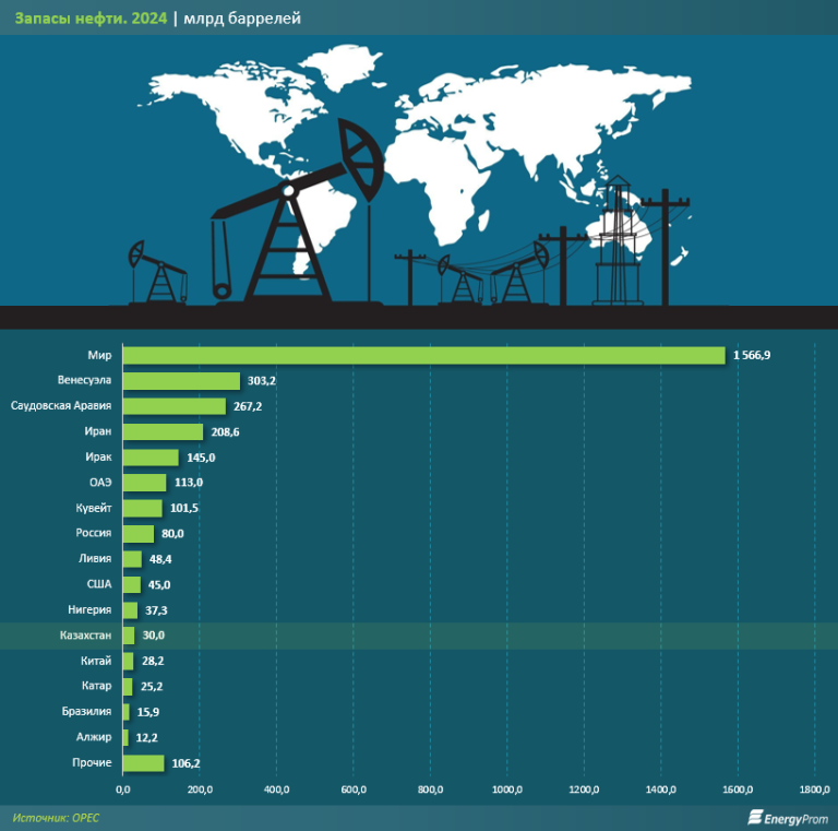 Структура мировых запасов нефти демонстрирует концентрацию ресурсов в странах с повышенными политическими и геополитическими рисками, что усиливает неопределённость на рынке и напрямую влияет на цены. Казахстан с ресурсной базой около 30 млрд баррелей занимает умеренную позицию.