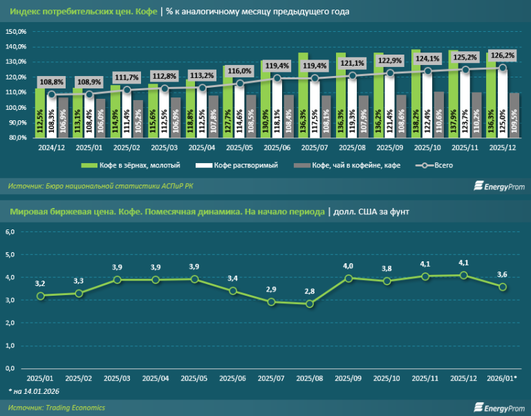 Такие ценовые скачки — не какая-то особенность внутренней торговли РК. Главными виновниками ситуации стали зарубежные поставщики. Кофе подорожал во всём мире. Данные международного портала Trading Economics позволяют отследить эту тенденцию. В декабре 2025-го фунт кофе на мировой бирже оценивался в 4,1 долл. США — на 28,1% больше, чем в январе этого же года.