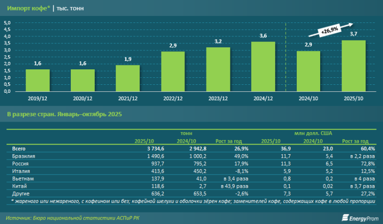 В целом за январь–октябрь прошлого года в Казахстан ввезли 3,7 тыс. тонн кофе — на 26,9% больше, чем за аналогичный период 2024-го. Это наибольший объём за последние несколько лет. В денежном выражении показатель увеличился сразу на 60,4%, до 36,9 млн долл. США.
