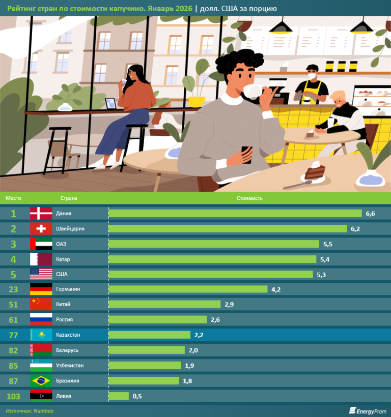 Впрочем, в казахстанских городах стоимость кофе ещё не самая высокая. Судя по рейтингу медиапортала Numbeo, в январе 2026 года Казахстан находился на 77-м месте среди 103 стран по цене чашки капучино. В РК она стоит 2,2 долл. США (1,1 тыс. тг) — в три раза дешевле, чем в европейских странах, занимающих верхние строчки рейтинга. Например, в Дании за порцию ароматного напитка платят 6,6 долл. США (3,3 тыс. тг), в Швейцарии — 6,2 долл. США (3,2 тыс. тг).