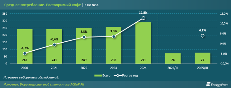 Судя по выводам аналитиков мировых СМИ, высокие цены на кофе мотивируют потребителей во многих странах искать альтернативу этому напитку. В Казахстане такой тенденции не наблюдается. Исходя из результатов выборочных обследований БНС, последние три года казахстанцы, наоборот, увеличивали потребление растворимого кофе. Это вполне объясняет растущий импорт. За третий квартал прошлого года среднее потребление кофе в РК составило 77 граммов на человека — на 4,1% больше, чем за аналогичный период 2024-го.