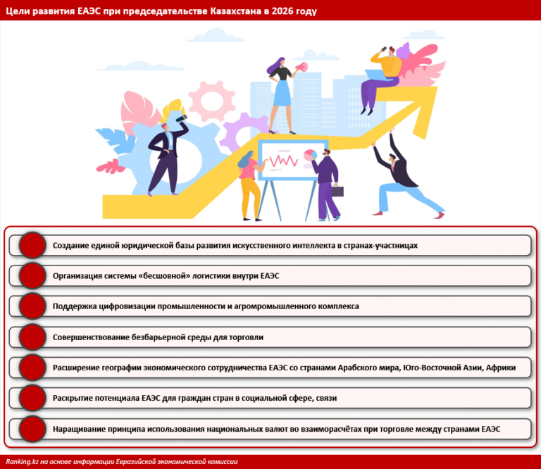 Первое место в списке ключевых направлений занимает активное развитие цифровизации экономик. Власти РК поставили цель сделать Казахстан цифровым государством и намерены помогать развивать экосистемы с искусственным интеллектом в других странах ЕАЭС. Глава государства уже предложил России, Беларуси, Кыргызстану и Армении в мае подписать Совместное заявление об ответственном развитии ИИ в рамках ЕАЭС.