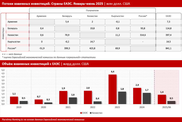 За первое полугодие 2025-го Казахстан получил от соседей по союзу инвестиции на довольно внушительную сумму: 460,2 млн долл. США. Большая часть этих средств пришлась на вложения из России. В то же время РК также приняла участие в экономических проектах РФ, инвестировав в них 314,6 млн долл. США.