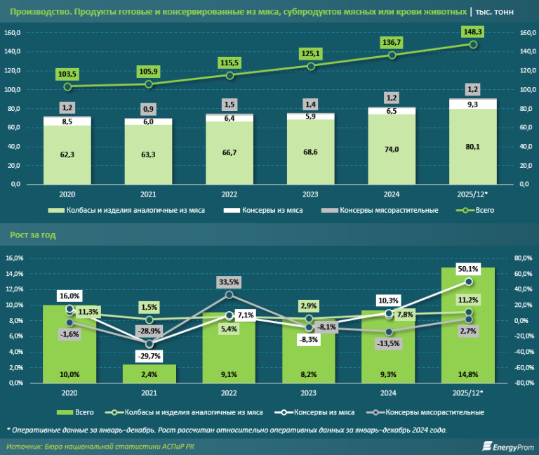 Так, согласно данным Бюро национальной статистики АСПиР РК, за январь–декабрь прошлого года казахстанские производители выпустили 9,3 тыс. тонн мясных консервов — сразу на 50,1% больше, чем за аналогичный период 2024-го. И объём выпуска, и его годовой рост стали максимальными показателями в секторе за последние годы. Ранее динамика была неравномерной: так, в 2021 году наблюдалось даже уменьшение объёма до 6 тыс. тонн. Важное методологическое примечание: рост объёмов производства за январь–декабрь 2025 года, как по категории в целом, так и по видам продукции, рассчитан в сравнении с оперативными данными 2024 года. За предыдущие годы уже есть уточнённые данные, которые приведены в графиках ниже.