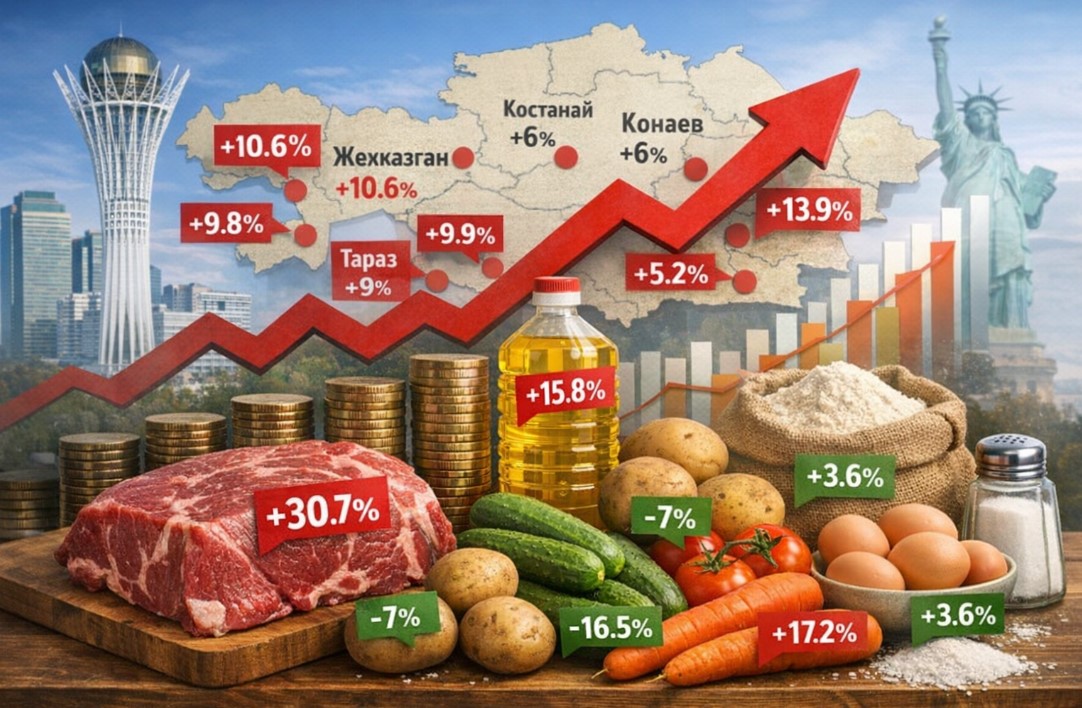 Серьёзнее всего СЗПТ подорожали в Жезказгане: сразу на 10,6% за год. Следом идут Актау (на 9,8%), Тараз (на 9%) и Семей (на 8,9%).