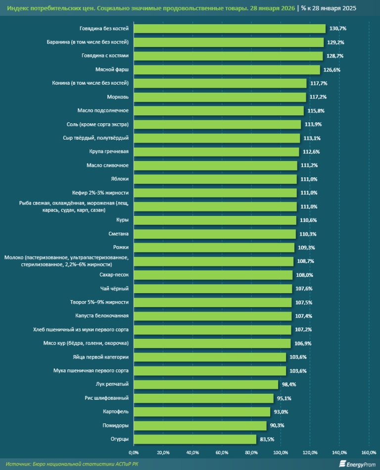 Средние цены на социально значимые продовольственные товары (СЗПТ) в Казахстане по итогам 28 января 2026-го выросли на 7,1% за год, а за неполный месяц с начала года — на 0,3%. Перечень СЗПТ, утверждённый приказом министра торговли и интеграции РК от 23 декабря 2025 года, включает 31 наименование продуктов питания.