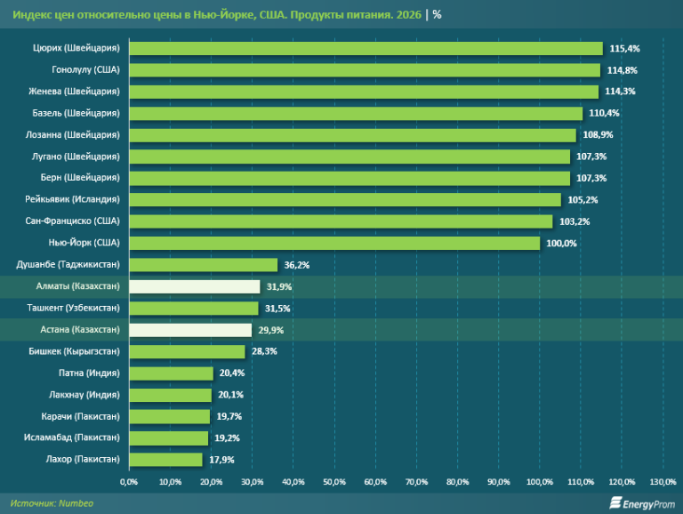 В Астане цены на продукты питания ниже нью-йоркских на 70,1%, в Алматы — на 68,1%. Ташкент занял промежуточное положение среди городов ЦА с индексом 31,5% (то есть на 68,5% дешевле, чем в Нью-Йорке). Единственной страной региона, не представленной в рейтинге Numbeo, оказался Туркменистан.