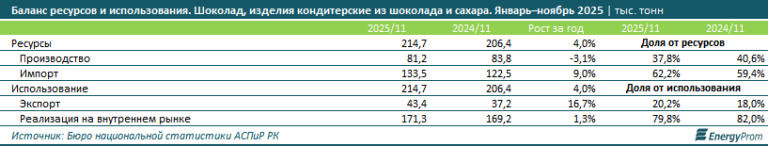 Экспорт и реэкспорт шоколада и кондитерских изделий из шоколада и сахара демонстрирует уверенный рост: на 16,7%, до 43,4 тыс. тонн за январь–ноябрь 2025 года. Реализация на внутреннем рынке выросла незначительно (всего на 1,3%), составив 171,3 тыс. тонн. Местные производители пытаются компенсировать слабый внутренний спрос за счёт выхода на внешние рынки.