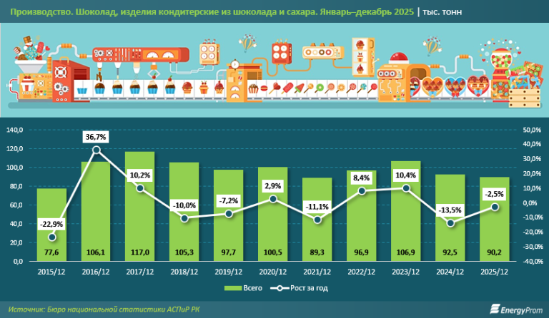 Если сравнивать с пиковыми показателями 2017 года, когда выпуск достиг 117 тыс. тонн, текущий объём производства в секторе оказался меньше почти на четверть. За десятилетие казахстанская шоколадная промышленность так и не смогла выйти на устойчивый рост, демонстрируя колебания объёма выпуска в диапазоне 90–110 тыс. тонн.