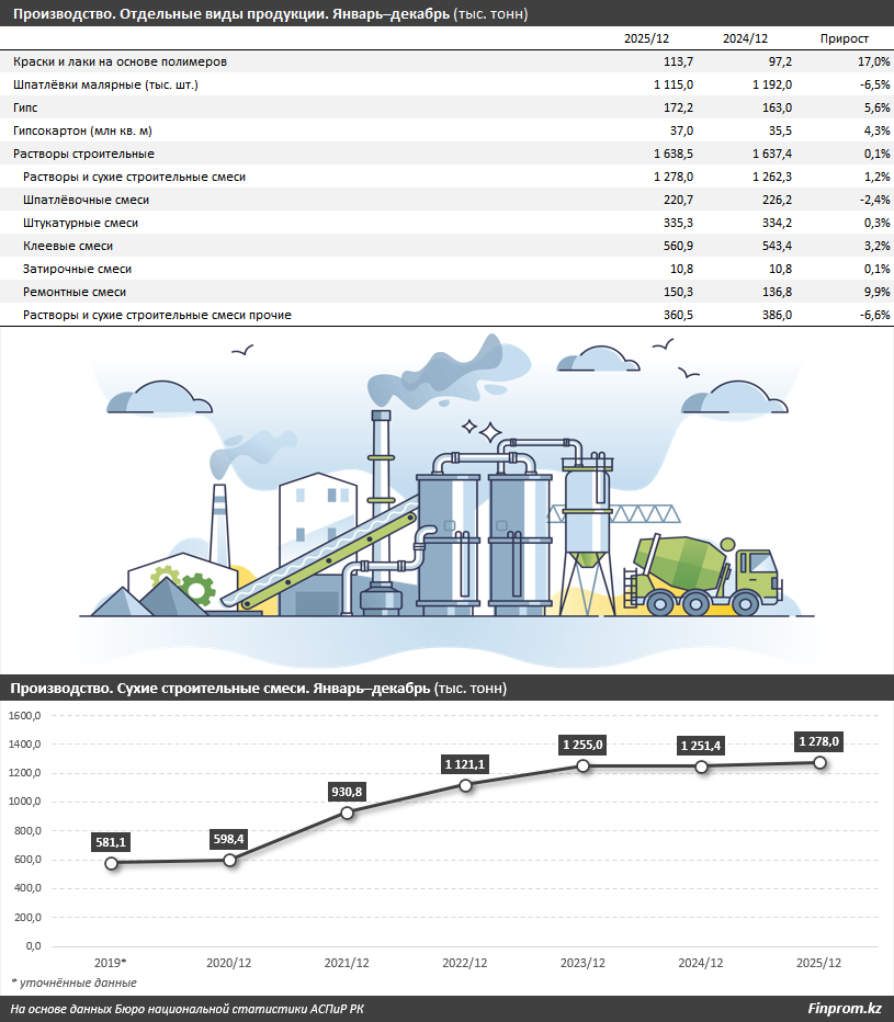 Схожую оценку и дают производители строительно-отделочных материалов. Например, по прогнозам Alina Group, в 2026–2029 годах ввод жилья в эксплуатацию в РК составит 18-19 млн кв. м, что соответствует нулевому росту. Alina Group работает на рынке сухих строительных смесей и лакокрасочной продукции 36 лет, объединяя 19 промышленных площадок в разных регионах и занимая более 40% рынка. В портфель холдинга входят бренды AlinEX и Alina Paint.