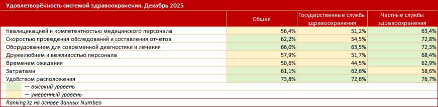 В частности, по данным на декабрь 2025-го, средний уровень удовлетворённости затратами пациентов в государственных медицинских учреждениях РК составил 62,6%, в частных клиниках — 58,6%. Этот индикатор показывает, насколько пациенты довольны своим расходами на услуги по шкале от 0% до 100%.