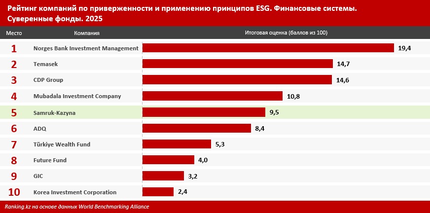 Так вот, среди суверенных фондов в 2025 году Фонд национального благосостояния «Самрук-Казына» вошёл в топ-5, получив 9,5 балла.