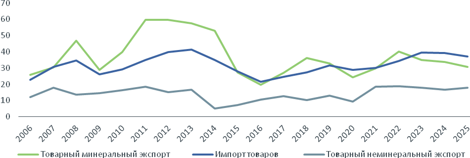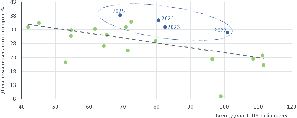 Даже при высоких объемах добычи нефти в 2023–2025 годах доля неминерального экспорта продолжала расти и была на 4–8 процентных пунктов выше уровней, характерных для предыдущих лет.