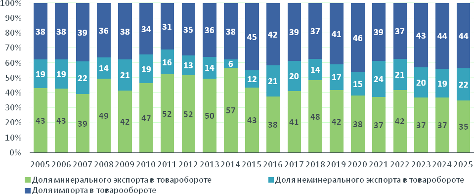 Импорт полностью восстановился после спада 2014–2022 годов, тогда как экспорт минеральной продукции растет более сдержанно по сравнению с пиковыми значениями 2011–2012 годов.
