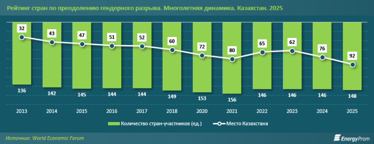 Таким образом, за период с 2013 по 2025 год Казахстан сместился вниз в мировом рейтинге на 60 позиций, что отражает, с одной стороны, усиление гендерного разрыва внутри страны, а с другой — более быстрый прогресс других экономик.