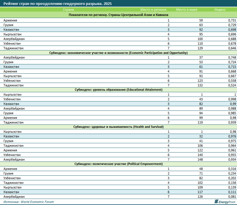 В общем рейтинге по преодолению гендерного разрыва среди стран Центральной Азии и Кавказа лидирует Армения, занявшая 59-е место в мире с индексом 0,731. На втором месте оказалась Грузия: 63-е место в мире, 0,729. Казахстан расположился на третьей позиции в регионе и на 92-м месте в глобальном рейтинге с индексом 0,698. Самые низкие показатели среди стран региона продемонстрировал Таджикистан: 129-е место в мире и индекс 0,646.