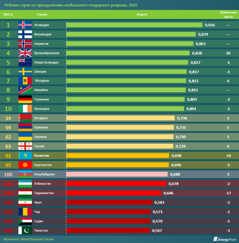 Индекс глобального гендерного разрыва за 2025 год показывает, что ни одна экономика мира пока не достигла полного гендерного равенства. Исландия (92,6%) продолжает возглавлять рейтинг, удерживая первое место уже 16 лет подряд, и остаётся единственной экономикой, закрывшей более 90% гендерного разрыва с 2022 года.