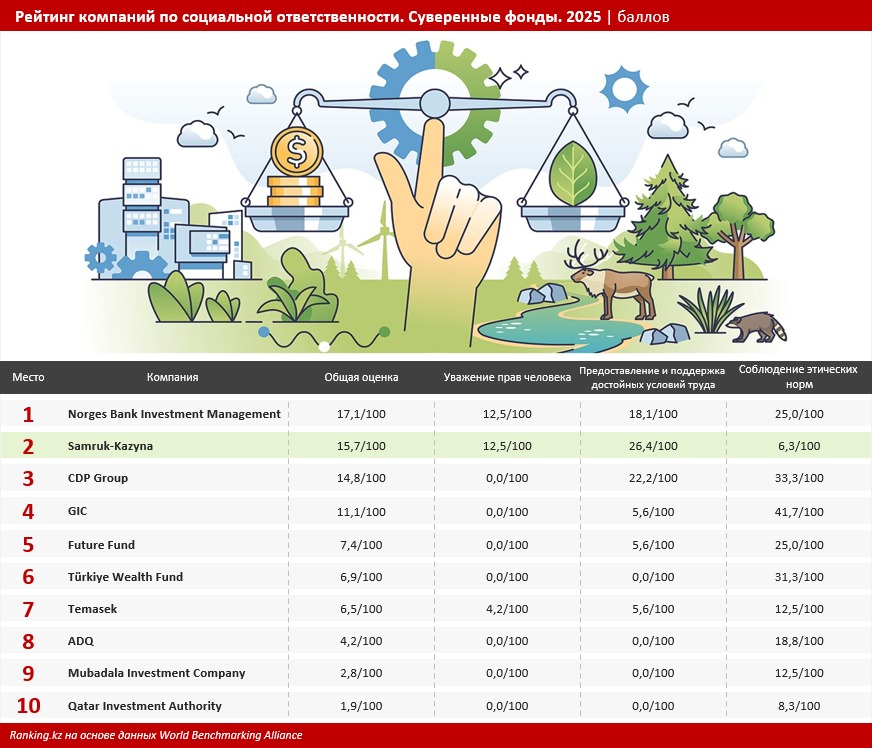 Приведём наглядный пример: согласно исследованиям независимой международной организации World Benchmarking Alliance (WBA), казахстанский Фонд национального благосостояния «Самрук-Казына» расположился на втором месте среди суверенных фондов в рейтинге по социальной ответственности (Social Benchmark), который учитывает приверженность компаний таким принципам, как: