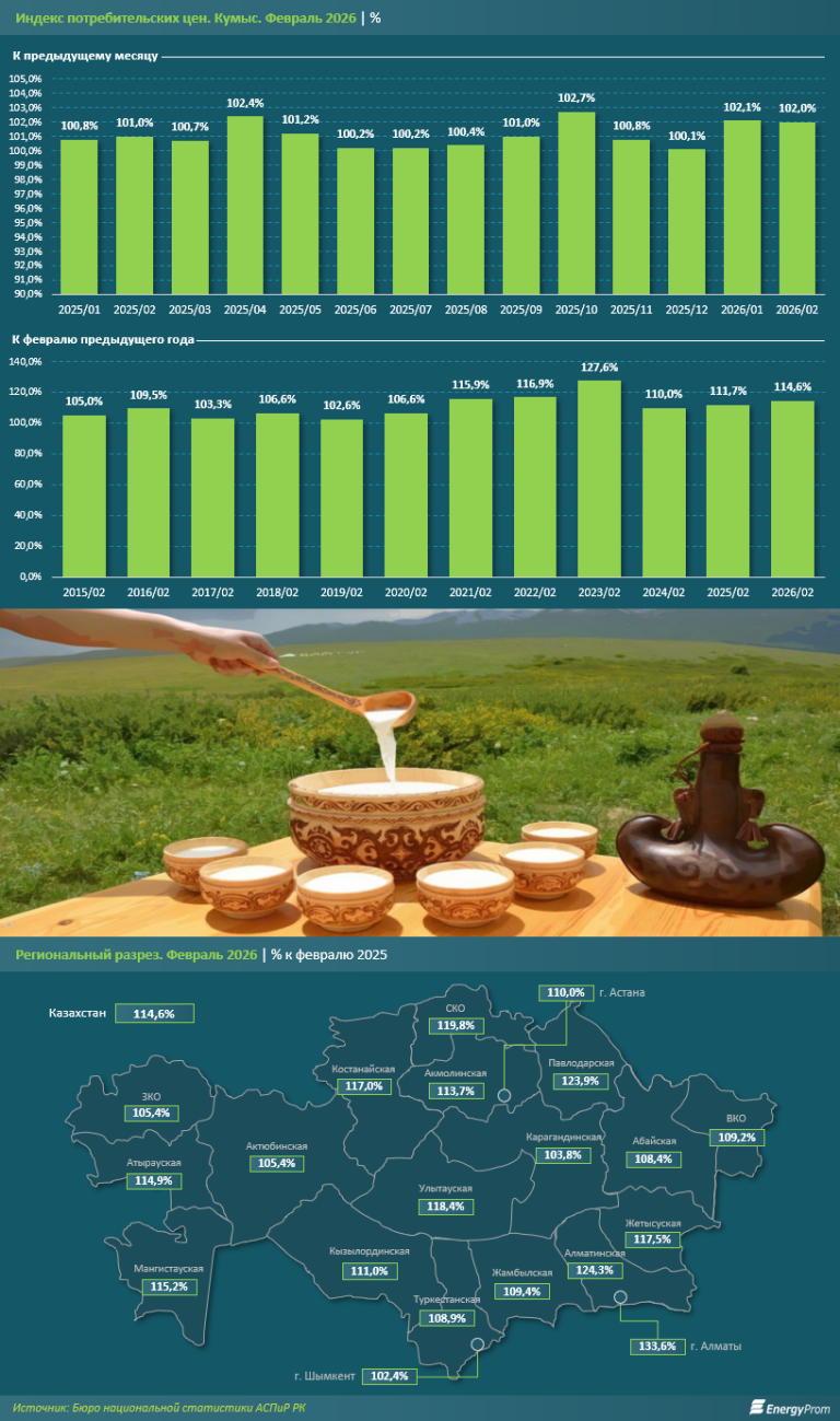 В региональном разрезе цены растут неравномерно. Наиболее заметное удорожание кумыса в феврале текущего года было зафиксировано в Алматы: сразу на 33,6% за год. Существенный рост цен также был отмечен в Алматинской (на 24,3%) и Павлодарской (на 23,9%) областях. В то же время в отдельных регионах динамика оказалась значительно слабее: например, в Карагандинской области удорожание составило 3,8%, в Шымкенте — 2,4%.