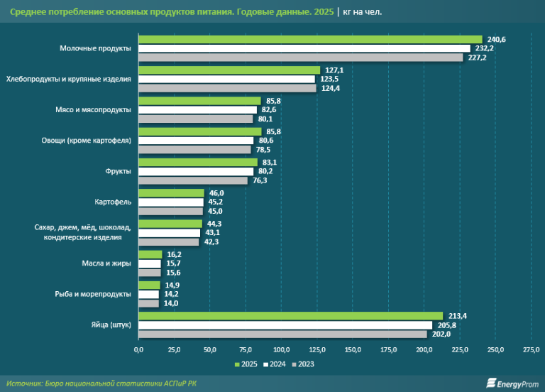 Молочные продукты остаются одной из ключевых категорий в рационе казахстанцев. Для сравнения: потребление мяса составило 85,8 кг, фруктов — 83,1 кг, а рыбы — всего 14,9 кг на человека. Высокая востребованность молочных продуктов создаёт устойчивую базу для спроса на национальные напитки, однако промышленный сектор может не успевать за потребностями рынка.