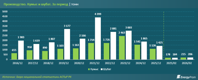 Данные за январь-февраль текущего года также указывают на сохраняющуюся нестабильность. Производство кумыса составило 215 тонн — на 20,8% больше, чем за аналогичный период 2025-го (178 тонн), но всё ещё значительно ниже уровня января-февраля 2024 года (314 тонн). По шубату показатели остаются сдержанными: 206 тонн, против 184 тонн годом ранее и 479 тонн два года назад. Это говорит о частичном восстановлении, но без выхода на прежние объёмы.