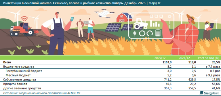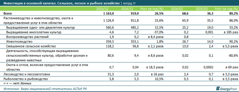 Согласно данным Бюро национальной статистики (БНС) АСПиР РК, за период с 2020 по 2025 год в Казахстане наблюдался неравномерный, но в целом положительный тренд объёмов инвестиций в сельское, лесное и рыбное хозяйство. По итогам прошлого года этот важный финансовый показатель достиг психологической отметки в 1,2 трлн тг. Рост в 1,5 раза к уровню предыдущего года был связан исключительно с низкой базой 2024-го. Заметим: инвестиции в основной капитал — величина непостоянная, зависящая от появления новых проектов, строительства ферм, покупки нового оборудования. Она априори не может быть год от года исключительно одинаковой или увеличивающейся. Поэтому та самая низкая база 2024 года, то есть меньший показатель, чем в 2023-м — всего лишь цикличное развитие сектора. При этом рост 2025 года отражает восстановление инвестиционной активности бизнеса. Данные за первые два месяца 2026-го подтверждают сохранение позитивной динамики. За январь-февраль в сектор вложили уже более 68,6 млрд тг — на 89,2% больше, чем за аналогичный период прошлого года.
