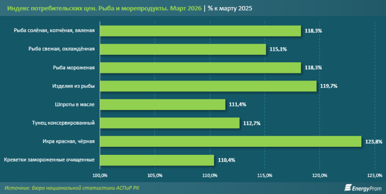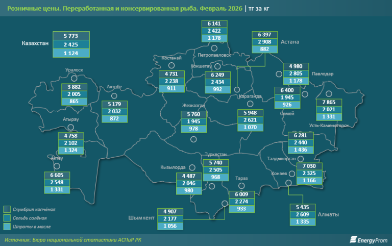 В феврале 2026 года стоимость переработанной и консервированной рыбы в казахстанских городах распределилась неравномерно. Средняя цена копчёной скумбрии по стране составила 5,8 тыс. тг за кг. Наибольшая стоимость была зафиксирована в Усть-Каменогорске (7,9 тыс. тг), Конаеве (7 тыс. тг) и Актау (6,6 тыс. тг). Наиболее доступной копчёная скумбрия была в Уральске (3,9 тыс. тг за кг) и Кызылорде (4,5 тыс. тг).
