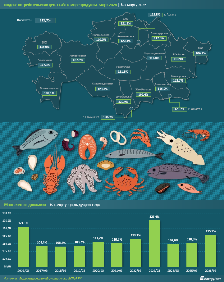 Рост потребительских цен на рыбу и морепродукты был зафиксирован во всех без исключения регионах РК. Самое заметное удорожание ощутили жители Улытауской области, где цены взлетели почти на треть. В число регионов с наибольшими показателями роста стоимости рыбы и морепродуктов также вошли Кызылординская область (на 23,8%), Алматы (на 23,2%) и Акмолинская область (на 23,1%). В Жетысуской и Северо-Казахстанской областях цены увеличились на 22,7% и на 22,3% соответственно. Наименее выраженное, но всё же заметное удорожание было отмечено в Мангистауской (на 3,1%) и Жамбылской (на 3,4%) областях.