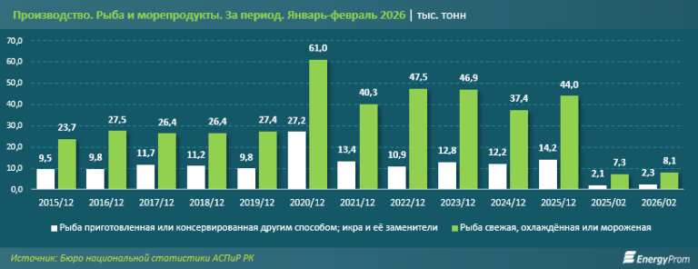 Рыбная отрасль Казахстана начала 2026 год с заметного оживления в производственном секторе. За первые два месяца текущего года отечественные предприятия выпустили 8,1 тыс. тонн свежей и мороженой рыбы — на 11,9% больше, чем за аналогичный период 2025-го. Положительную динамику демонстрирует и переработка: производство готовых изделий и консервов выросло на 9,2%, достигнув 2,3 тыс. тонн. Этот рост продолжает тренд 2025 года, когда за двенадцать месяцев объёмы выпуска рыбы увеличились на 17,7%, а готовой рыбной продукции — на 16,9%.