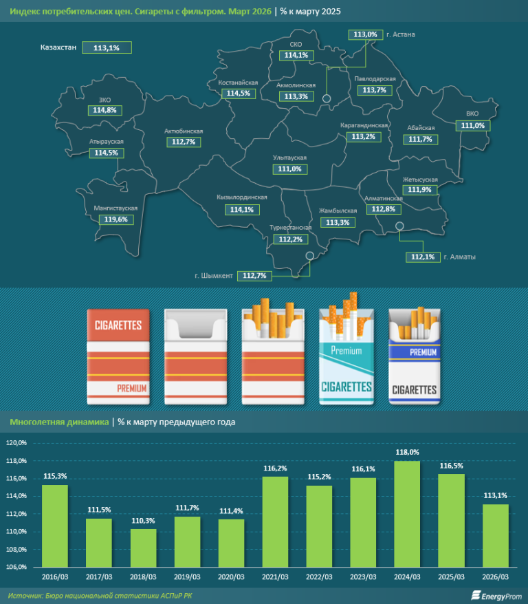 Несмотря на преобладание местной продукции, стоимость табачных изделий для конечного потребителя продолжает стабильно расти, хотя темпы инфляции в секторе несколько замедлились. В марте 2026-го сигареты с фильтром подорожали на 13,1% в годовом выражении (годом ранее рост составлял 16,5%, а в марте 2024-го — 18%).