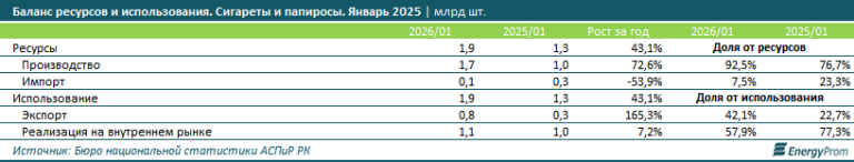 По итогам января 2026-го спрос (реализация на внутреннем рынке плюс экспорт) на сигареты и папиросы практически полностью был удовлетворён за счёт собственного производства. Доля отечественной продукции составила 92,5%, против 76,7% годом ранее. Объём выпуска в январе вырос на 72,6%, достигнув 1,7 млрд штук. Импорт, напротив, сократился более чем вдвое: на 53,9%, до 142 млн штук.