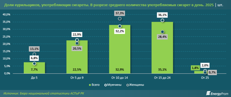 Несмотря на рост цен, доля курящих остаётся стабильной: в 2025 году курил каждый шестой житель РК в возрасте от 15 лет (17,5%).