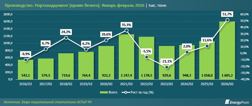 За январь-февраль 2026-го производство портландцемента (кроме белого) в Казахстане составило 1,6 млн тонн, более чем в полтора раза превысив показатель аналогичного периода прошлого года. Для сравнения: в январе-феврале 2025-го объём выпуска составлял 1,1 млн тонн, увеличившись на 11,6% за год.