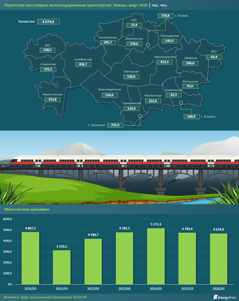 Основная нагрузка по перевозкам пассажиров железнодорожным транспортом приходится на крупные транспортные хабы. Лидерами по численности перевезённых пассажиров по итогам января–марта текущего года стали Астана (729,8 тыс. человек) и Алматы (560,9 тыс. человек). Следом идут Актюбинская (436,7 тыс. человек), Карагандинская (413,3 тыс. человек) и Кызылординская (324,6 тыс. человек) области. В то же время в ряде регионов железнодорожный транспорт играл минимальную роль в пассажирских перевозках: в Алматинской области было перевезено всего 42,3 тыс. человек, в Жетысуской — 35,6 тыс. человек, в Восточно-Казахстанской — 63,4 тыс. человек. Такая дифференциация указывает на неравномерную транспортную связанность и различную степень зависимости регионов от железнодорожной инфраструктуры.