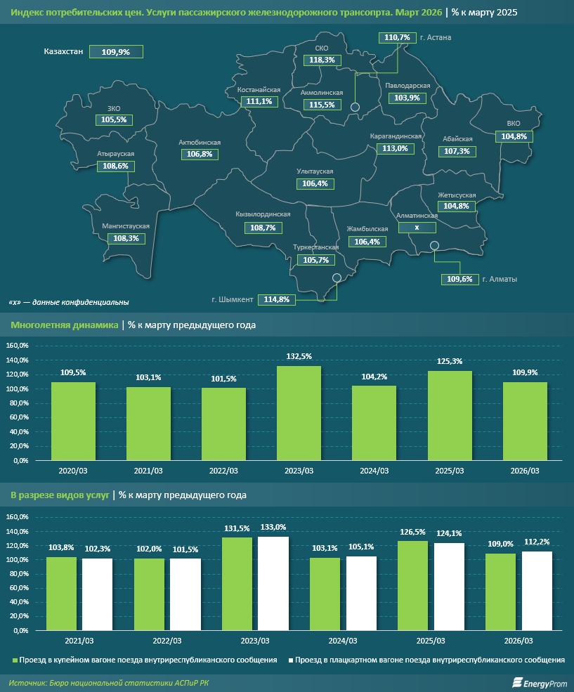 В разрезе регионов ценовая динамика оставалась неоднородной. Наибольшее удорожание услуг пассажирского железнодорожного транспорта было зафиксировано в Северо-Казахстанской (на 18,3%), и Акмолинской (на 15,5%) областях, а также в Шымкенте (на 14,8%). Наименее заметно цены выросли в Павлодарской области (на 3,9%), а также в Восточно-Казахстанской и Жетысуской областях (на 4,8% в каждом из регионов).