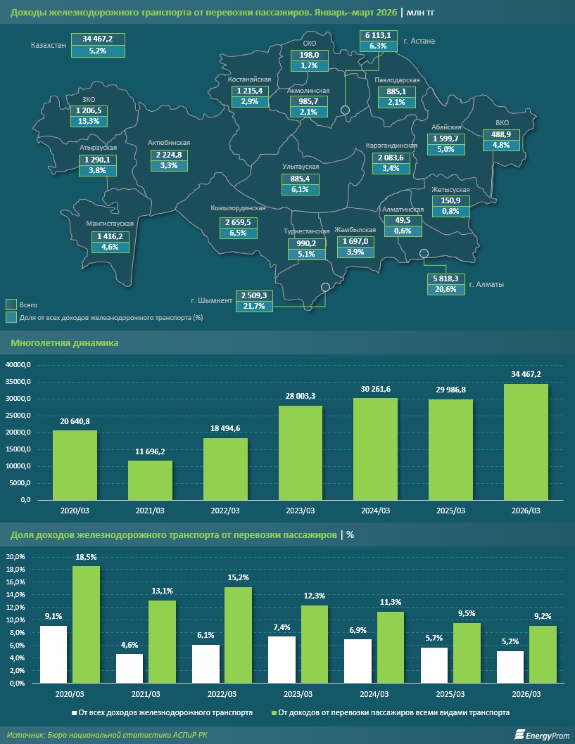 В региональном разрезе доходы от пассажирских перевозок железнодорожного транспорта формируются преимущественно за счёт крупнейших городов и отдельных областей. Основной вклад в январе–марте 2026-го обеспечили Астана (6,1 млрд тг), Алматы (5,8 млрд тг) и Шымкент (2,5 млрд тг), а также Кызылординская область (2,7 млрд тг).