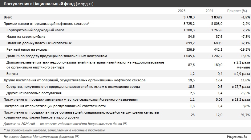 Анализ поступлений в Нацфонд за прошлый год не так оптимистичен. Общая сумма поступлений в 2025 году составила около 3,8 трлн тг — на 1,8% меньше, чем годом ранее. «Подкачали» как раз нефтяные налоги, уменьшившиеся на 2,2%. Разница была обусловлена уменьшением доли Казахстана по разделу продукции, рентного налога на экспорт и дополнительных платежей недропользователей.