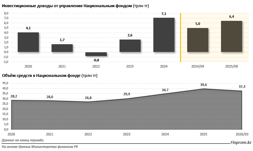 Отдельным блоком можно выделить статистику по инвестиционному доходу, получаемому Национальным фондом по своему текущему инвестпортфелю. Полные данные опубликованы пока только за 9 месяцев прошлого года: за три квартала доходы от управления фондом достигли 6,4 трлн тг. В сравнении с аналогичным периодом 2024-го рост был значительным: на 29,3%.