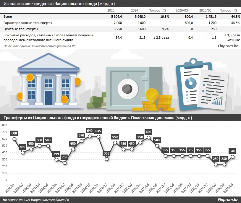 Анализ структуры расходов показывает значительное сокращение гарантированных трансфертов: с 1,2 трлн до 800 млрд тг. Целевые же трансферты в государственный бюджет в текущем году и вовсе не осуществлялись. Помесячная статистика Национального банка РК демонстрирует, что объёмы перечислений из фонда в госбюджет в январе, феврале и марте текущего года оказались минимальными с начала 2025-го.