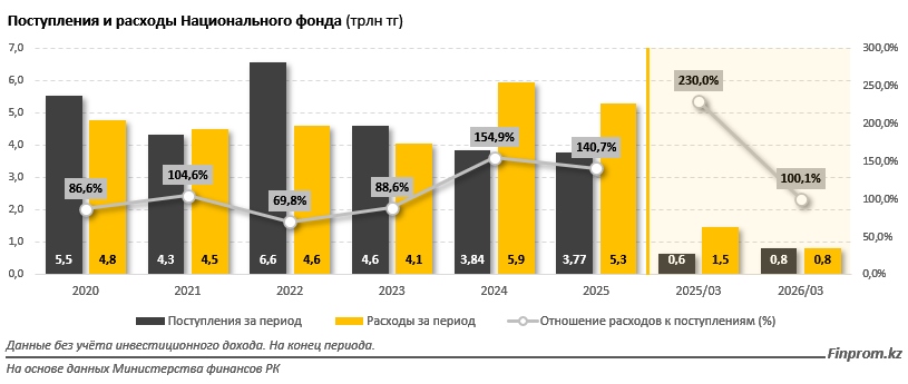 Новая политика в отношении расходов из главной «кубышки» страны ожидаемо привела к сокращению соотношения расходов и поступлений. В первом квартале 2026-го этот показатель достиг минимального значения за последние два года: расходы составили всего 100,1% от поступлений. Однако несмотря на то, что разница была небольшой, расходы Национального фонда всё так же остались больше, чем его доходы. Для сравнения: за аналогичный период прошлого года из фонда изъяли в 2 раза больше средств, чем он генерировал.