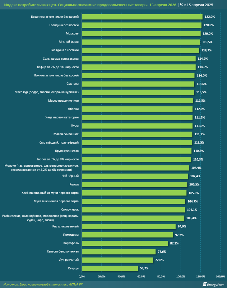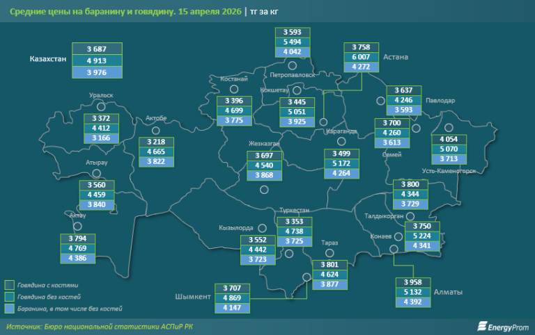Ценовая ситуация подтверждается и уровнем средних цен. Так, в среднем по стране говядина с костями на 15 апреля стоила 3,7 тыс. тг за кг, говядина без костей — 4,9 тыс. тг, баранина, в том числе без костей — около 4 тыс. тг. Астана выделялась аномально высокой стоимостью бескостной говядины (более 6 тыс. тг за кг), в то время как в Усть-Каменогорске и Алматы были зафиксированы наибольшие цены на говядину с костями (4,1 тыс. и 4 тыс. тг соответственно), а самая дорогая баранина продавалась в Алматы и Актау (по 4,4 тыс. тг за кг).