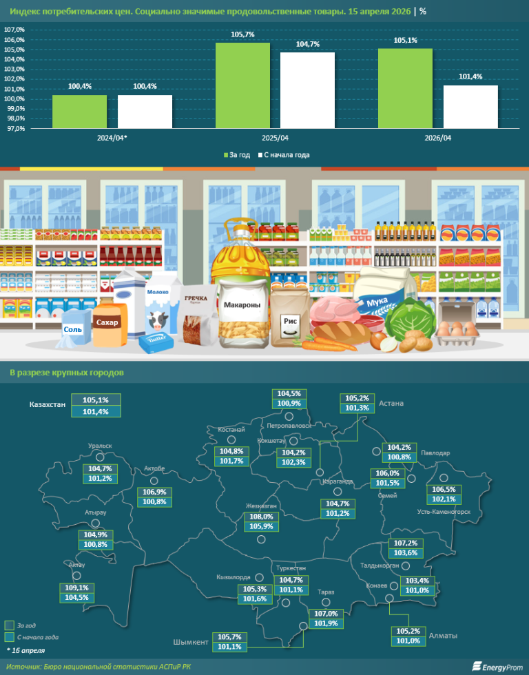 Эффективность работы местных исполнительных органов по сдерживанию цен демонстрирует значительный разброс. В ряде регионов показатели удорожания СЗПТ существенно превышают среднереспубликанский уровень. Наихудшая ситуация на 15 апреля текущего года наблюдалась в Актау, где за год цены на социально значимые продовольственные товары для населения выросли сразу на 9,1%. Следом идут Жезказган и Талдыкорган: на 8% и на 7,2% соответственно. Наибольшее удорожание СЗПТ с начала года так же пришлось на эти города: в Жезказгане — на 5,9%, в Актау — на 4,5%, в Талдыкоргане — на 3,6%.